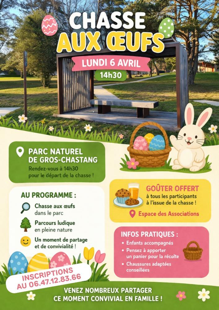 Chasse aux œufs (6/04) 6 avril 2026 Actualité Inscrivez-vous à la Chasse aux œufs de la commune organisée ce lundi 6 avril à 14h30 dans le parc naturel de Gros-Chastang !