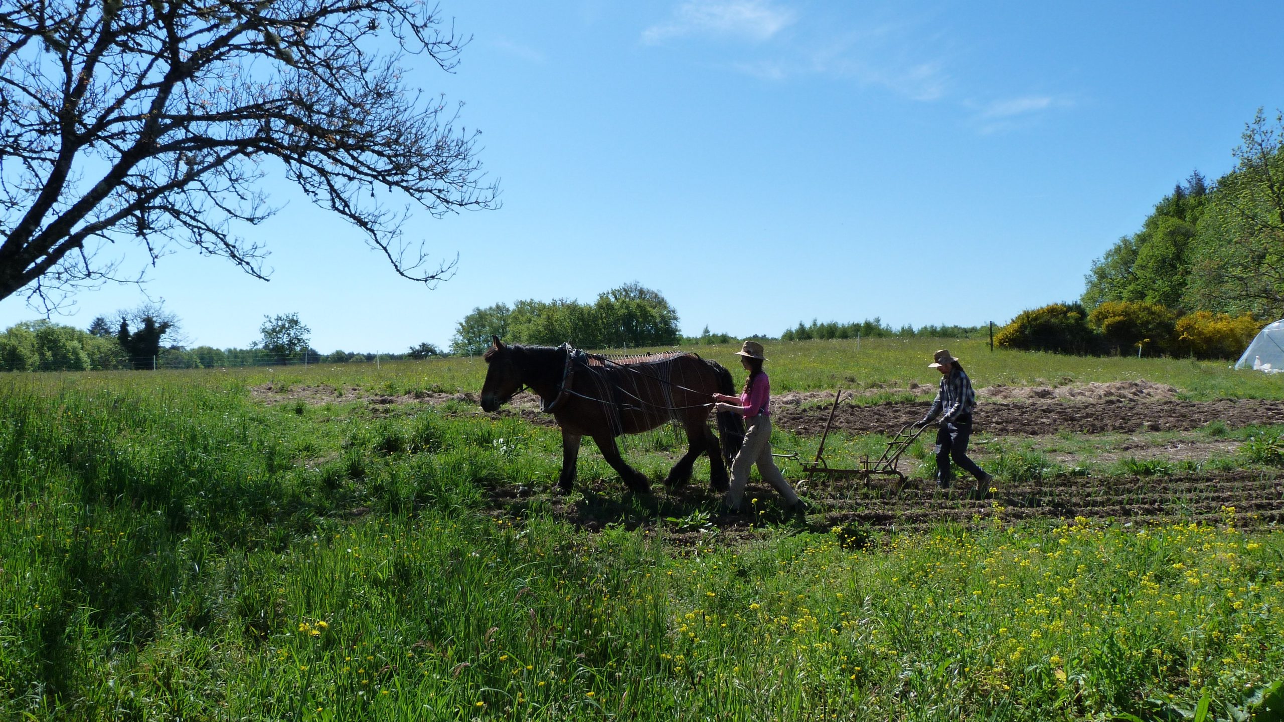 Notre jument de trait, Dalila, nous aide dans les différents travaux de préparation du sol et de désherbage. Après sa grande collaboration, nous prenons le relais pour les semis, repiquages, récoltes et pour la commercialisation !
